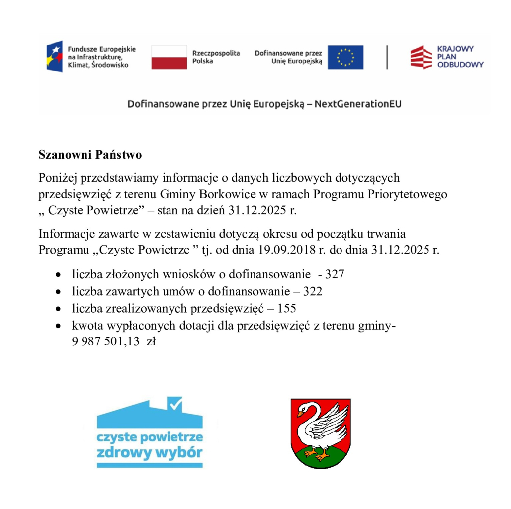 W 2026 roku Gmina Borkowice przeznaczy na inwestycje 17.5 mln złotych, z czego 12,7 mln to środki zewnętrzne pozyskane z programów Polski Ład – 7,6 mln zł, KPO – 4,95 mln zł oraz z LGD ,, Razem na Piaskowcu” - 193 tys. zł. Budżet inwestycyjny może się zwiększyć o kolejne pozyskane środki zewnętrzne, na które gmina złożyła i będzie składać wnioski.
