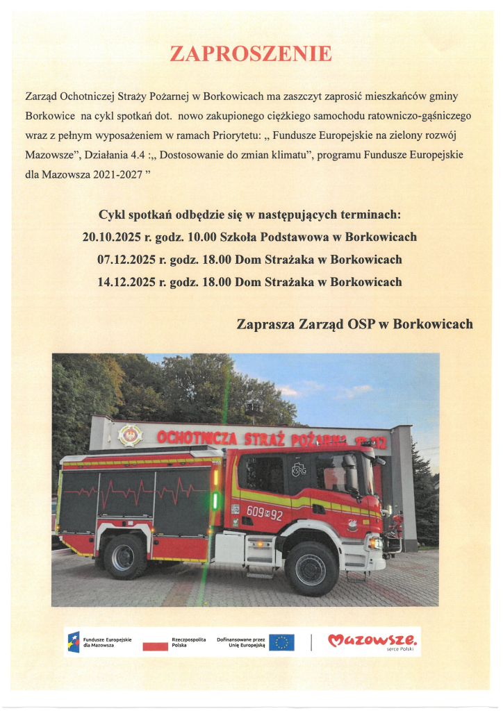 dniach 20.10.2025 r., 07.12.2025 r. oraz 14.12.2025 r. na terenie gminy Borkowice odbył się cykl spotkań dotyczących nowo zakupionego ciężkiego samochodu ratowniczo-gaśniczego wraz z pełnym wyposażeniem, realizowanego w ramach Priorytetu „Fundusze Europejskie na zielony rozwój Mazowsza”, Działania 4.4 „Dostosowanie do zmian klimatu” programu Fundusze Europejskie dla Mazowsza 2021–2027.
