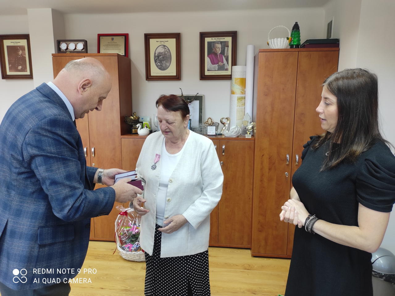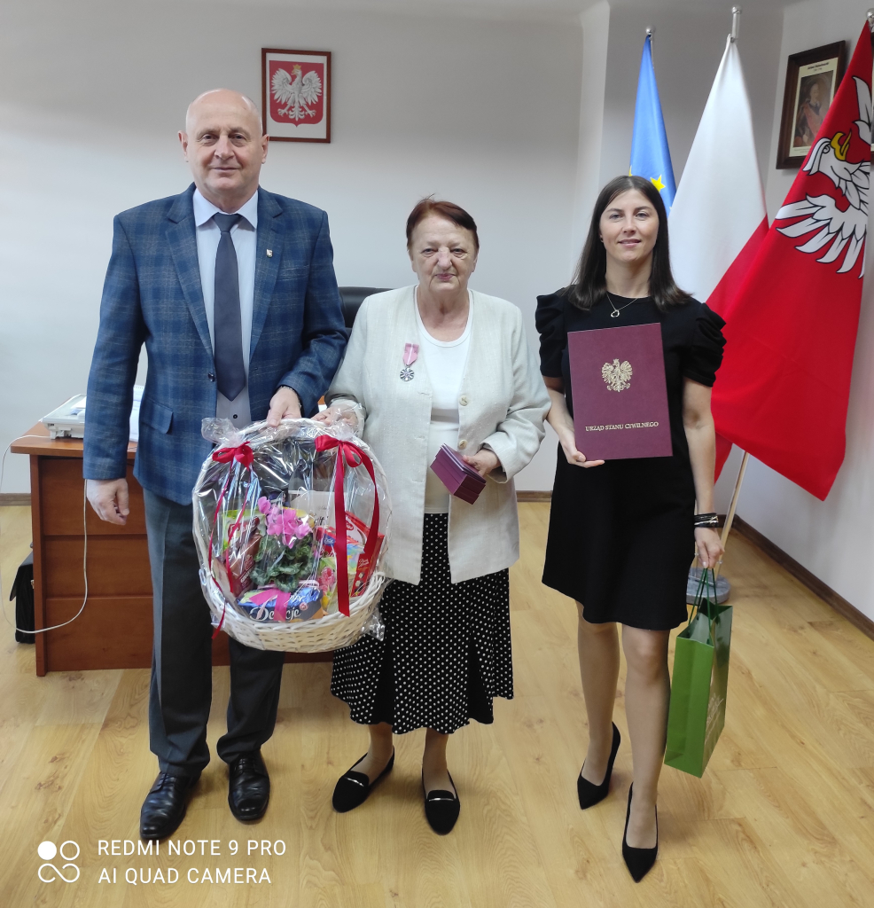 na ręce Pani Zofii Mosiołek przekazali medale przyznane przez Prezydenta Rzeczypospolitej Polskiej za długoletnie pożycie małżeńskie, okolicznościowe legitymacje oraz symboliczny upominek.